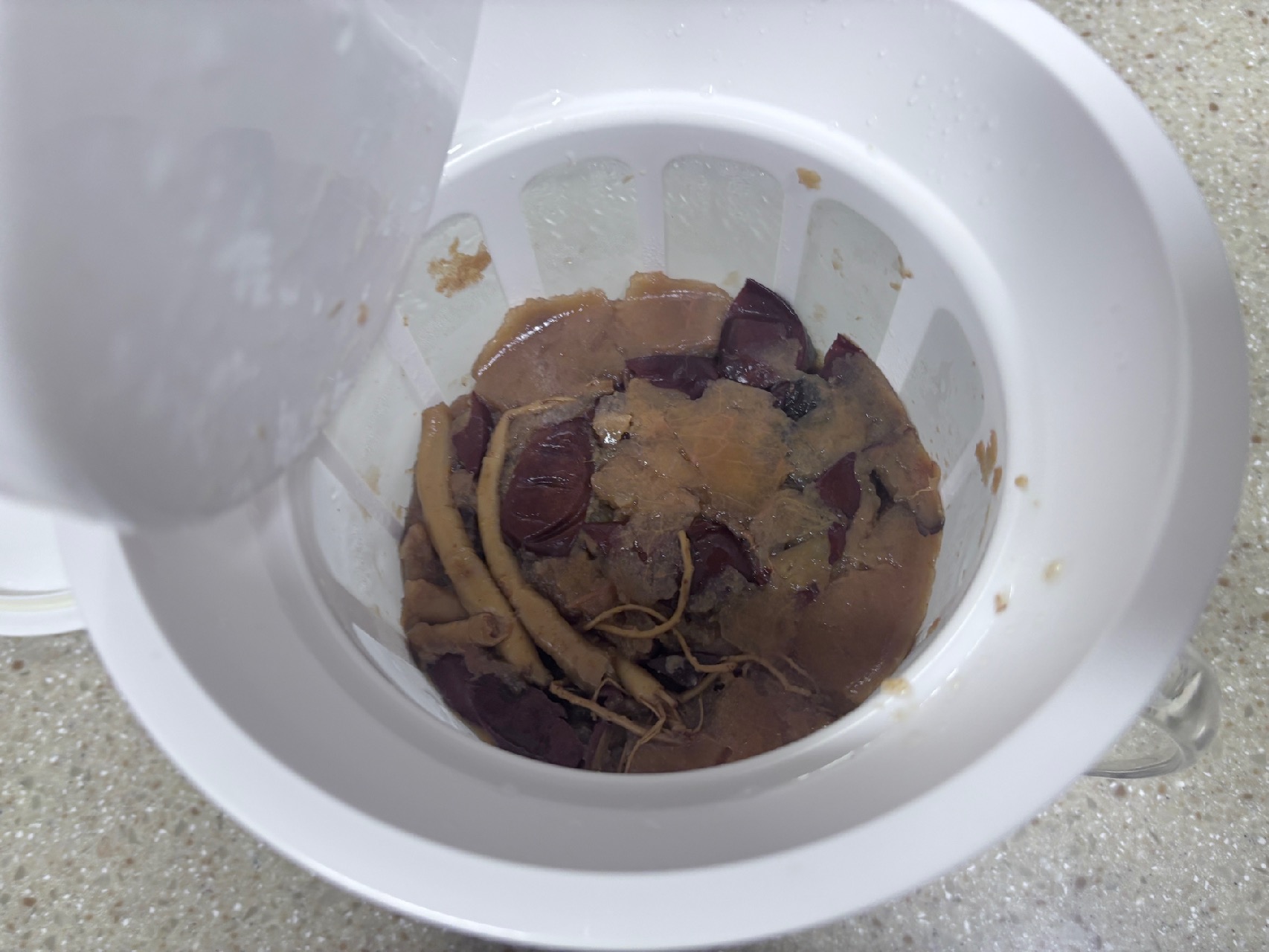 배 하나를 깎아서 잘라 넣었어요. 먹다 남아서 통아 담아뒀던 배조각도 함께 넣어줬습니다. 대추도 열심히 씨 부분만 버리고 조각내서 넣었어요. 인삼은 냉동실에 있던 인삼인데, 잔뿌리들만 톡톡 꺾어다가 넣어습니다.
