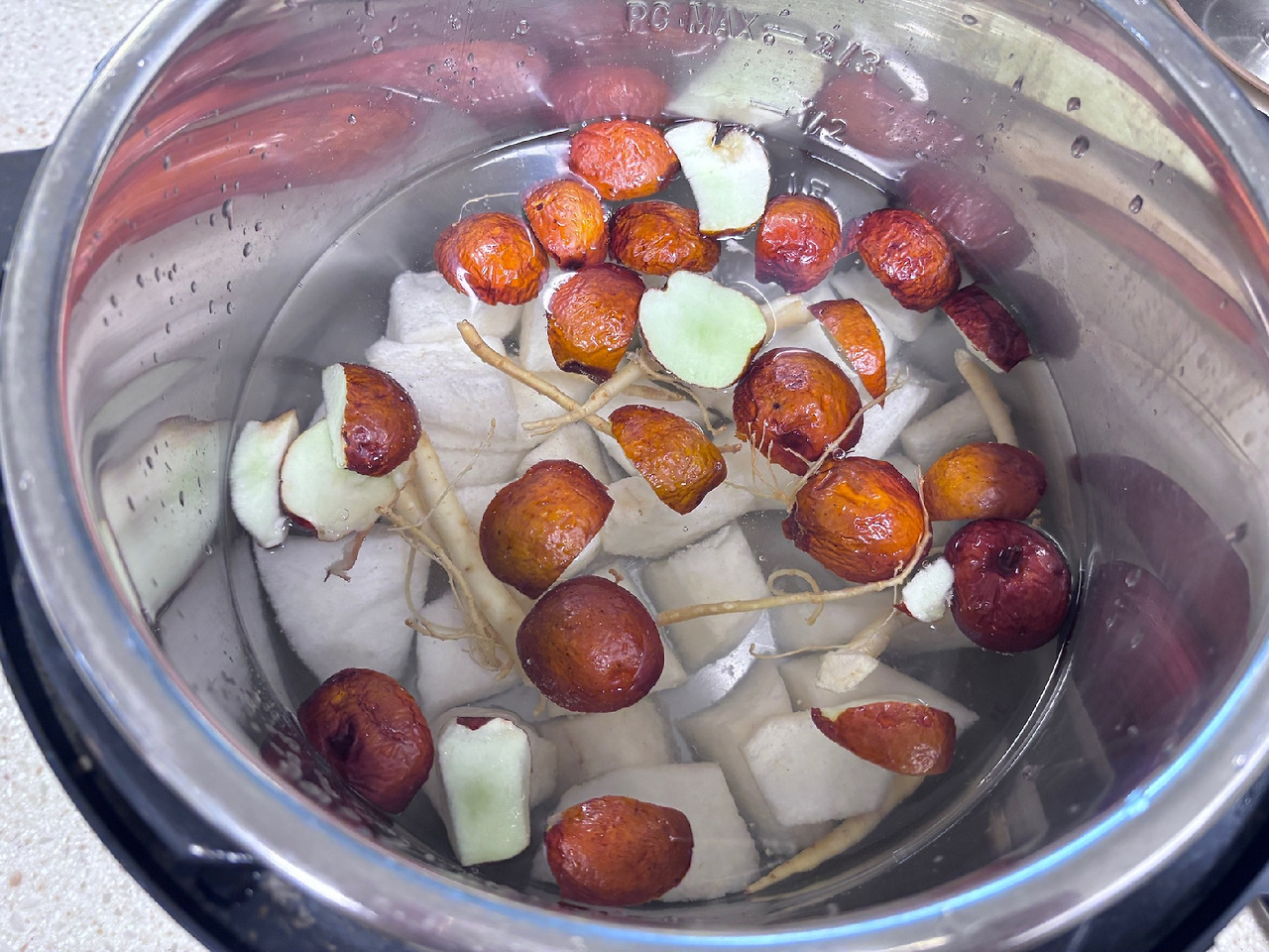 소분한 대추는 손바닥만한 지퍼팩 3개의 양이 나왔는데, 한팩정도의 양은 대추차 끓일 때 바로 사용하기로 했어요. 때마침 추석명절이 지났기 때문에 집에 배도 있지 뭐예요? 어릴 때 비염이 심하다며 엄마가 겨울아침마다 따끈하게 한잔씩 데워주셨던 대추배차를 만들어봤습니다. 물론 인스턴트팟으로요. 다 넣고 버튼만 누르면 끝!