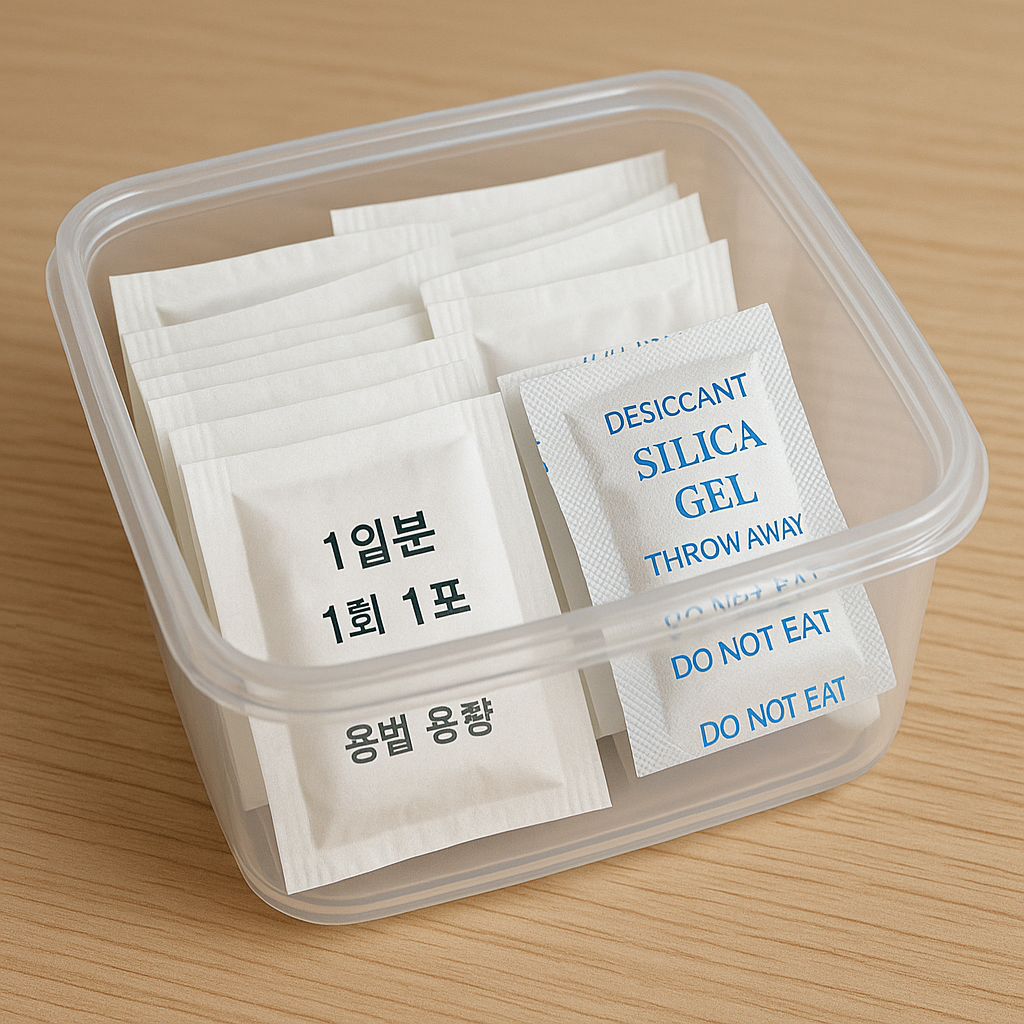 그런데 이 제습제를 사용하고 부터는 그런 일이 거의 없어졌어요. 냉장보관 항생제를 쓰지 않는 이상 말이죠! 방법은 간단해요. 제습제를 한 봉지 넣어둔 밀폐용기에 가루약을 봉지째 넣은 뒤 뚜껑을 닫아 보관하면 됩니다.