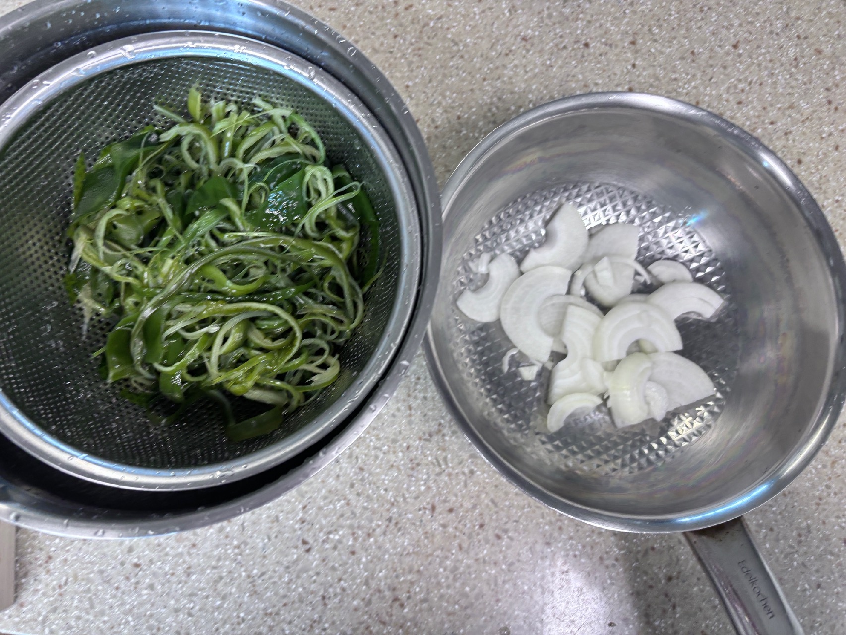 미역줄기를 깨끗한 물로 여러차례 행군 후 맛을 보았습니다. 적당히 간이 되어 있어 그냥 먹어도 꼬돌꼬돌한게 참 맛있었어요. 양파와 함께 넣고 볶아줍니다.