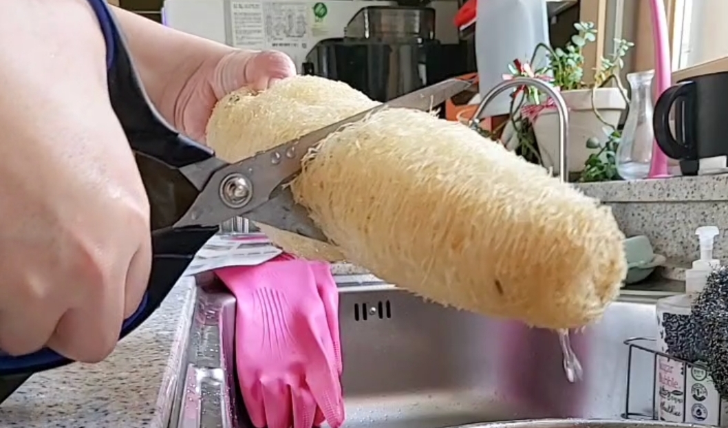 저는 3등분으로 잘라 사용하는 것을 선호해요. 물에 적혀서 잘라야 마른 수세미가 바스러지지 않기 때문에 반드시 물에 조금 불린 수세미를 잘라주세요. 수세미를 처음 물에 불릴 때 물이 뿌옇게 변하는데요. 이는 수세미에서 나온 진액 때문이라고 합니다. 처음에 깨끗하게 헹구어 사용하면 되니 걱정 마세요!