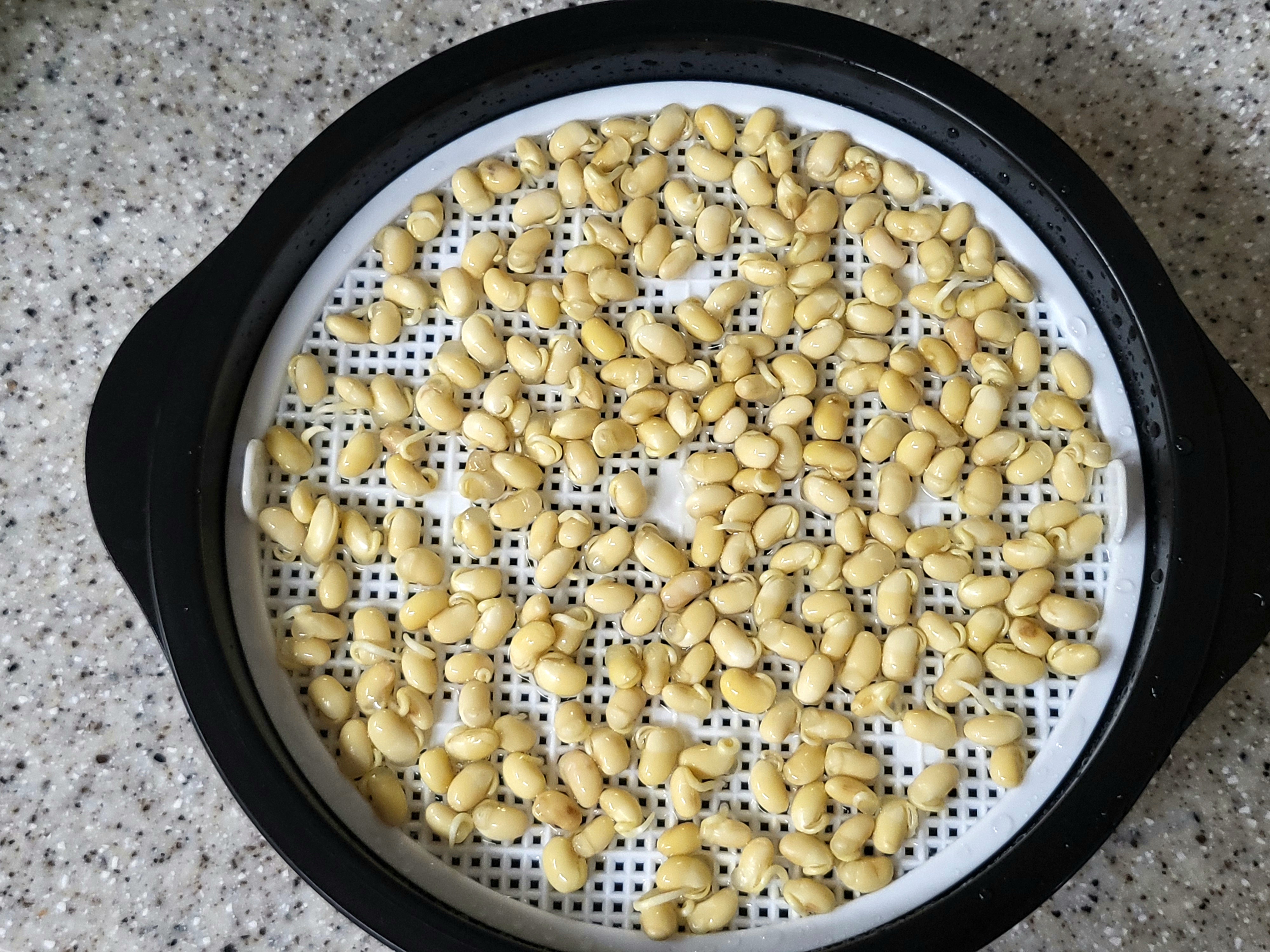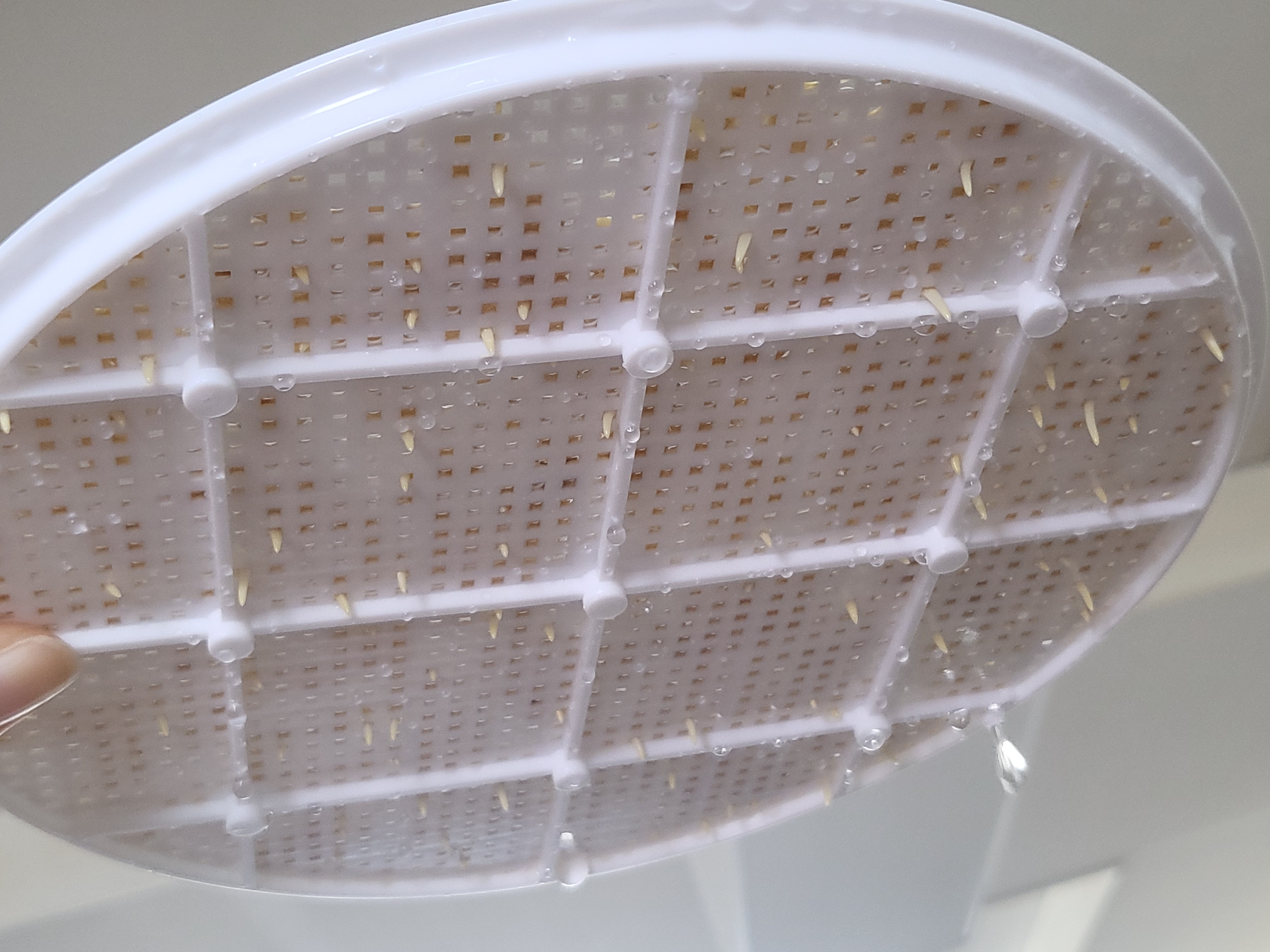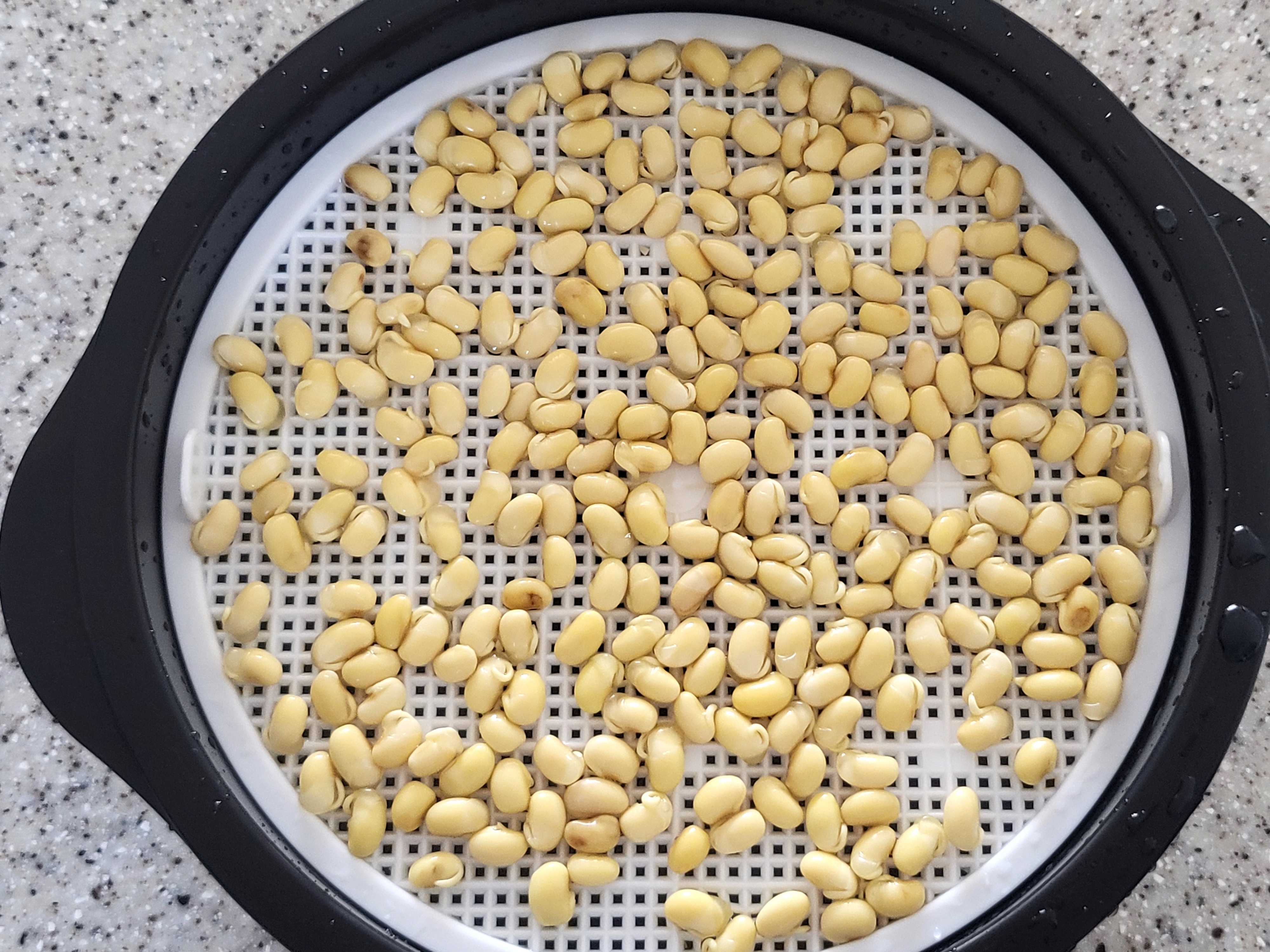 불린 콩을 콩끼리 서로 겹쳐지지 않게 잘 벌려서 채반 위에 놓아달라고 설명서에 쓰여있어서 그렇게 해봤어요. 예전엔 콩을 무더기로 그냥 뒀었는데 그게 실패의 원인이었던 걸까요....?