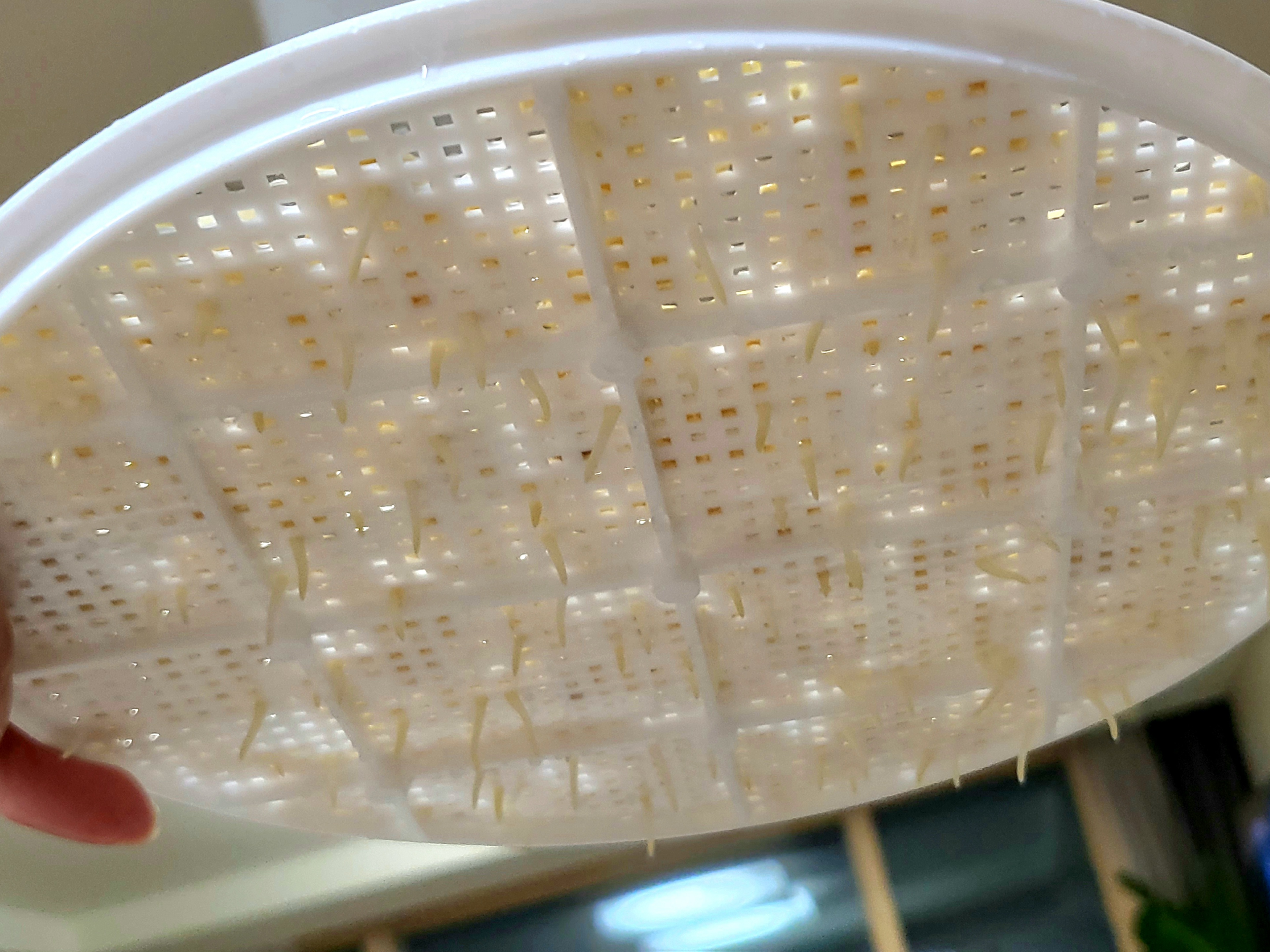세상에!!!!! 밑에서 보니 뿌리가 자라고 있어요. 4시간 만에 이게 무슨 일? 콩나물 키우기가 이렇게 순순히 진행되는 거라고? 작년에 내가 썩혀 버렸던 콩이 도대체 몇천 알인가ㅠㅠ