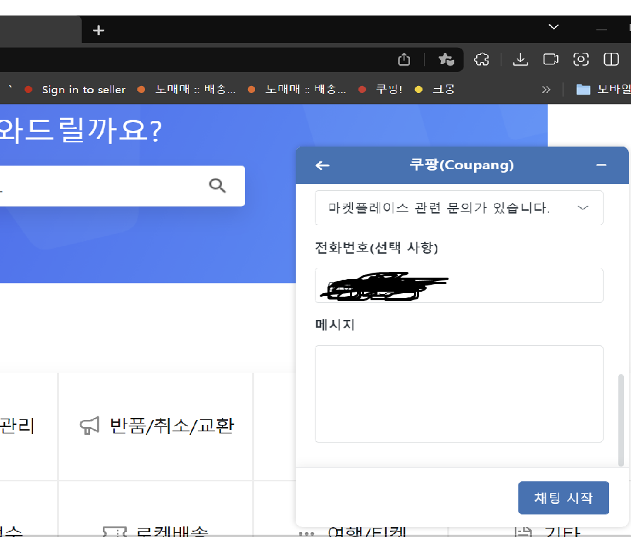 우선 쿠팡윙 왼쪽 메뉴바 가장 하단에 온라인문의로 들어갑니다. 그럼 새로운 창이 열리는데 오른쪽 하단의 돋보기에 말풍선 달린 고객센터 배너를 클릭하면 실시간 상담을 시작할 수 있습니다. 채팅시작을 클릭하면 업체코드, 스토어 이름, 담당자 이름, 주문번호, 고객이름 등을 입력하라고 안내가 나옵니다. 입력하라는 걸 입력하면 상담 대기번호가 나오는데 차례가 되면 컴퓨터에서 알람소리가 들리며 상담이 시작되었다는 것을 알려줍니다.