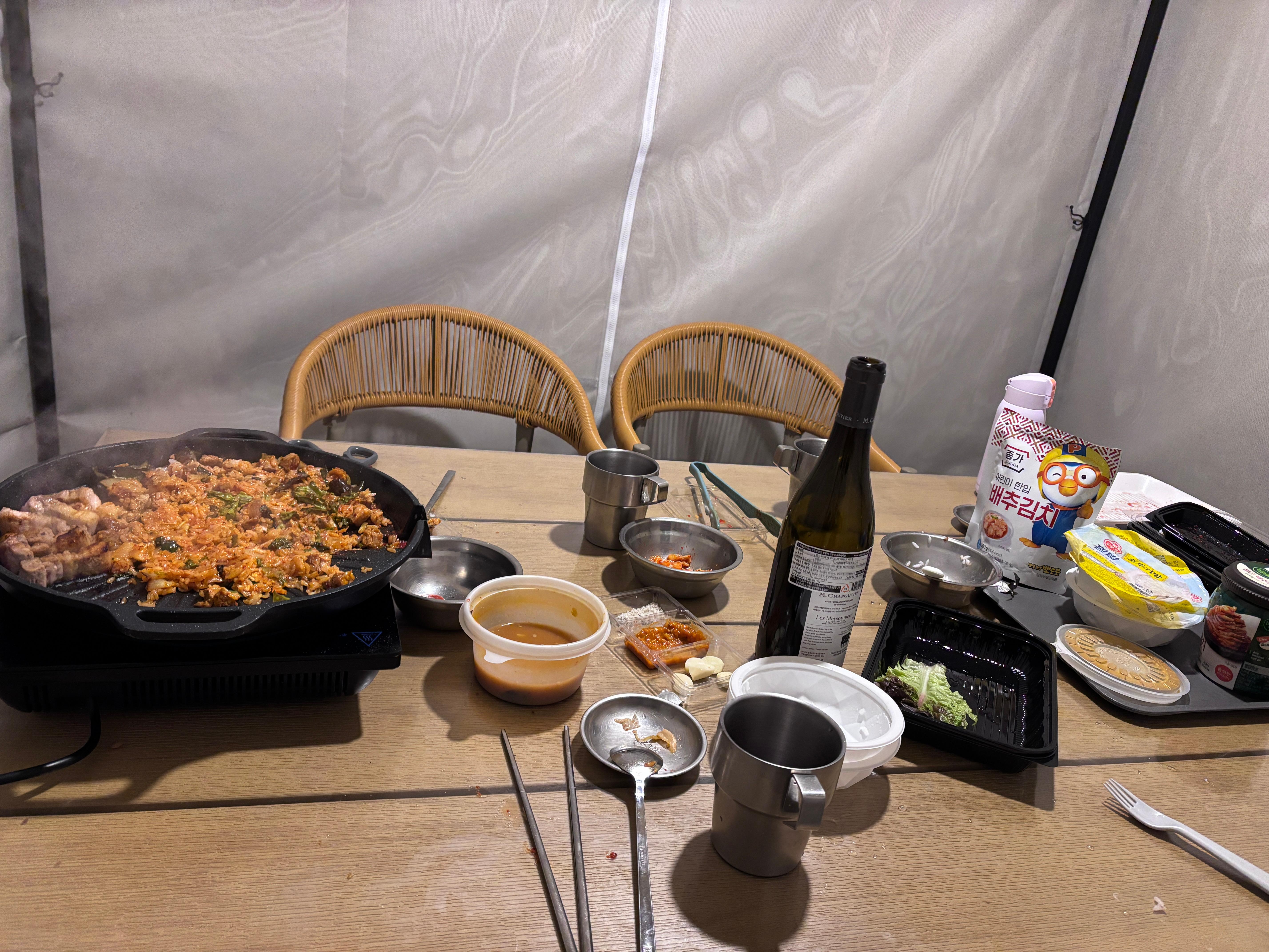 고기를 카라반 내부에서 구워먹을 수는 없으니 쉘터에서 먹었는데, 쉘터에 있는 히터가 무용지물일 정도로 내부가 추웠어요. 히터를 가장 강하게 틀어도 히터 가까이 손을 가져갔을 때만 따뜻했어요. 지퍼를 조금이라도 열어두면 온기가 빠져나갈 것 같아서 쉘터 지퍼를 끝까지 다 잠그고 있었는데도 추웠습니다. 그렇지만 여행이니까, 매일 이렇게 추운 게 아니니까 즐거운 추억으로 남았어요.