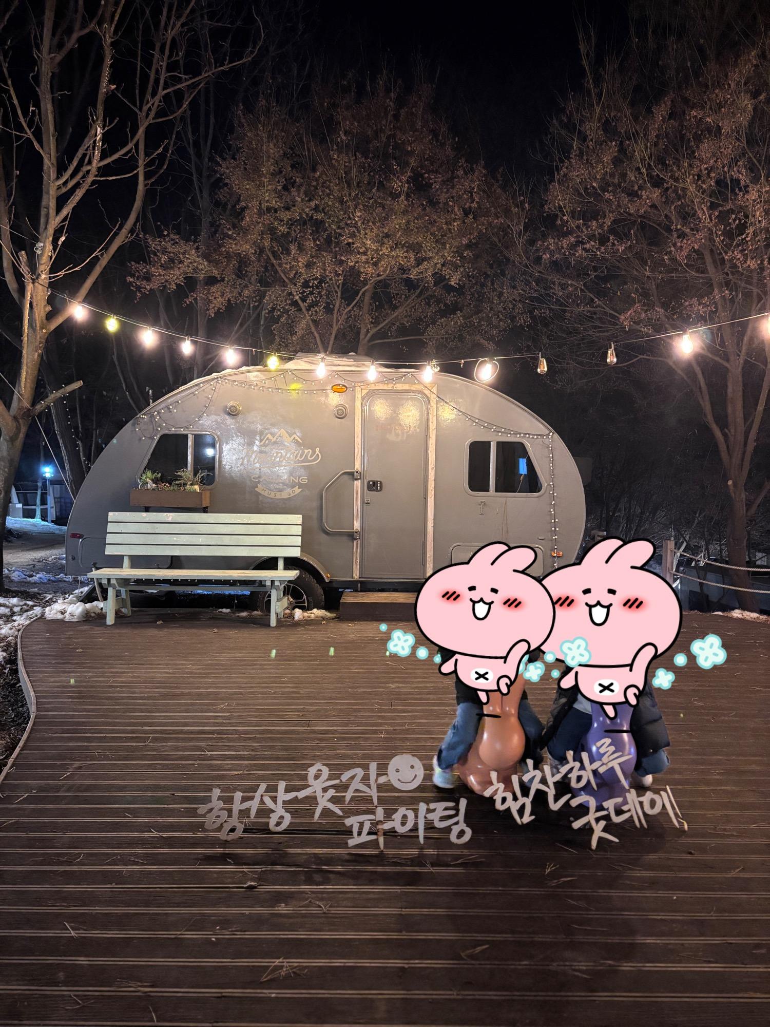 다행히 카라반 안은 춥지 않았어요. 바닥이 지글지글 끓고 있었거든요. 간이침대 위는 웃풍이 심해 꽤 추웠는데 바닥에 앉으면 너무 좋았어요. 꺠어있을 땐 괜찮았는데 잘 때는 너무 추웠어요. 온풍기까지 트니 너무 건조해서 자다 일어나 마스크 착용하고 잤습니다. 마스크 끼고 자니 좀 괜찮더라고요. 전기장판 위에서 잤던 저도 이렇게 추웠는데 간이침대에서 잤던 저희 신랑은 무지하게 추웠다고 하더라고요.