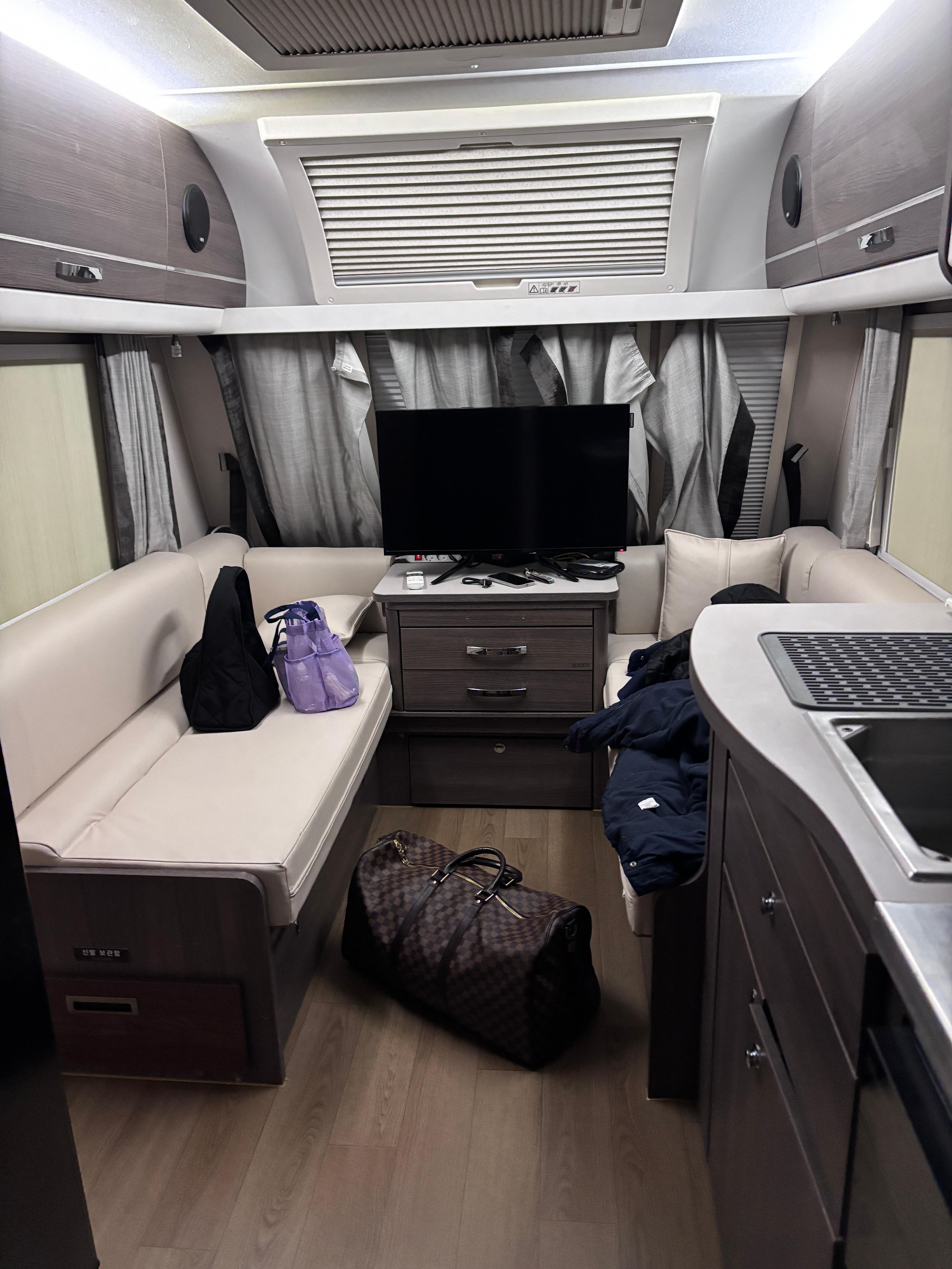 카라반이 처음이라 4인 충분히 잘 수 있는 공간일 줄 알았는데 생각보다 많이 좁아서 당황했어요, 심지어 테이블도 없어서 아이들이 가지고 놀려고 가져간 장난감도 제대로 갖고 놀지 못해서 아쉬웠어요. 바닥에서 놀기엔 바닥이 너무 좁았거든요ㅠㅠ 화장실도 변기에 앉으면 무릎이 닿을 정도로 좁았고 샤워부스는 그것보다 더 좁았는데 물놀이하고 와서 샤워할 일이 없어 다행이었어요. 아이들이 작은 게 이럴 땐 좋네요,