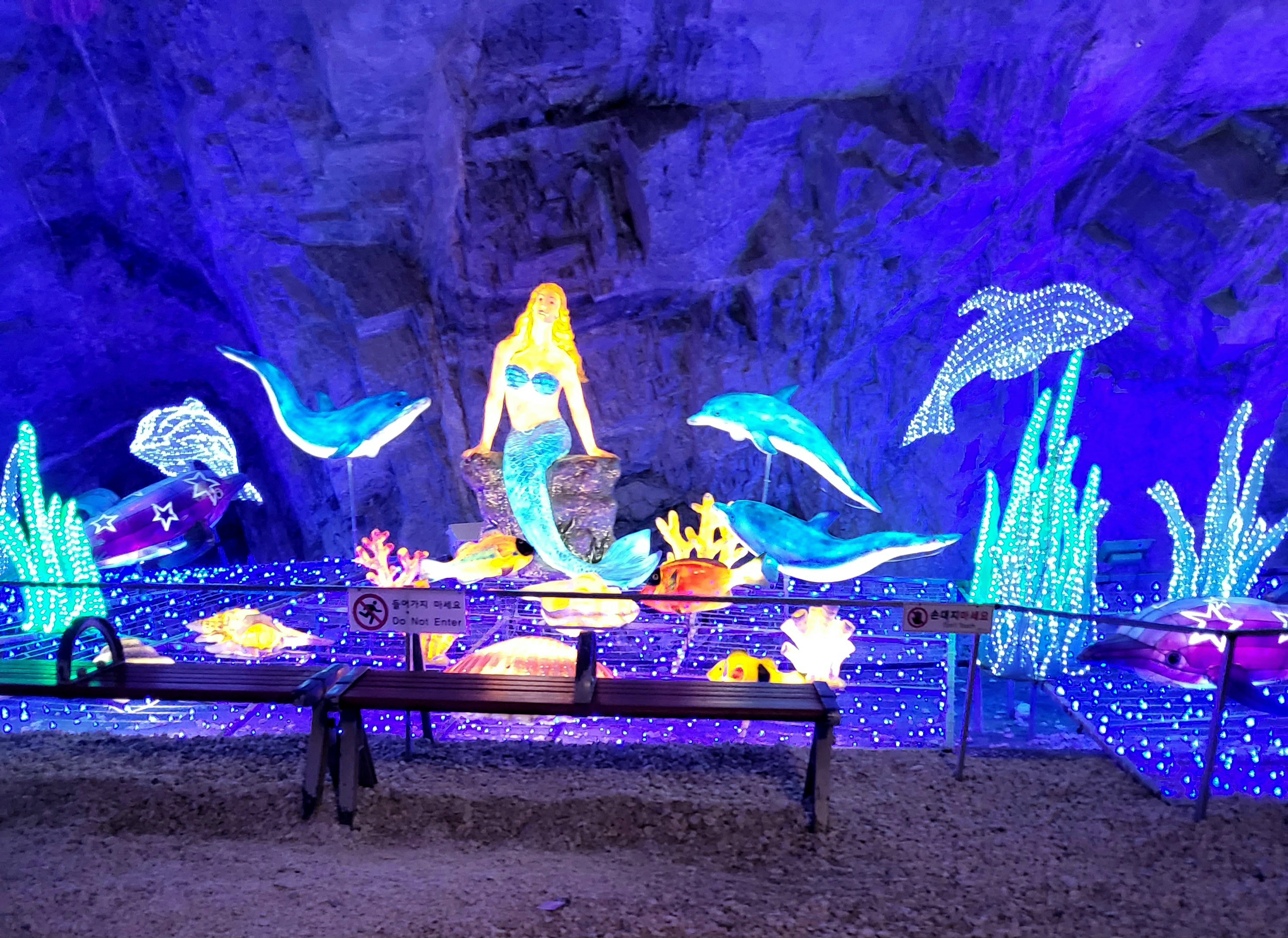 동굴 내부가 어둡다 보니 테마별로 알록달록한 불빛으로 예쁘게 꾸며놓았더라고요. 아르떼 미술관은 무서워했던 저희 둘째도 활옥동굴에선 예쁘다고 호들갑을 떨었습니다. 어두워서 무섭다고 할 줄 알았는데 엄청 좋아하더라고요! 특히 공주 좋아하는 우리집 딸들은 7번 해양 세계 빛의 공간을 가장 좋아했어요. 인어공주가 있었거든요..... 나가기 전에도 한번 더 보고 가고싶다고 또 갔습니다. 사진도 또 찍고요...