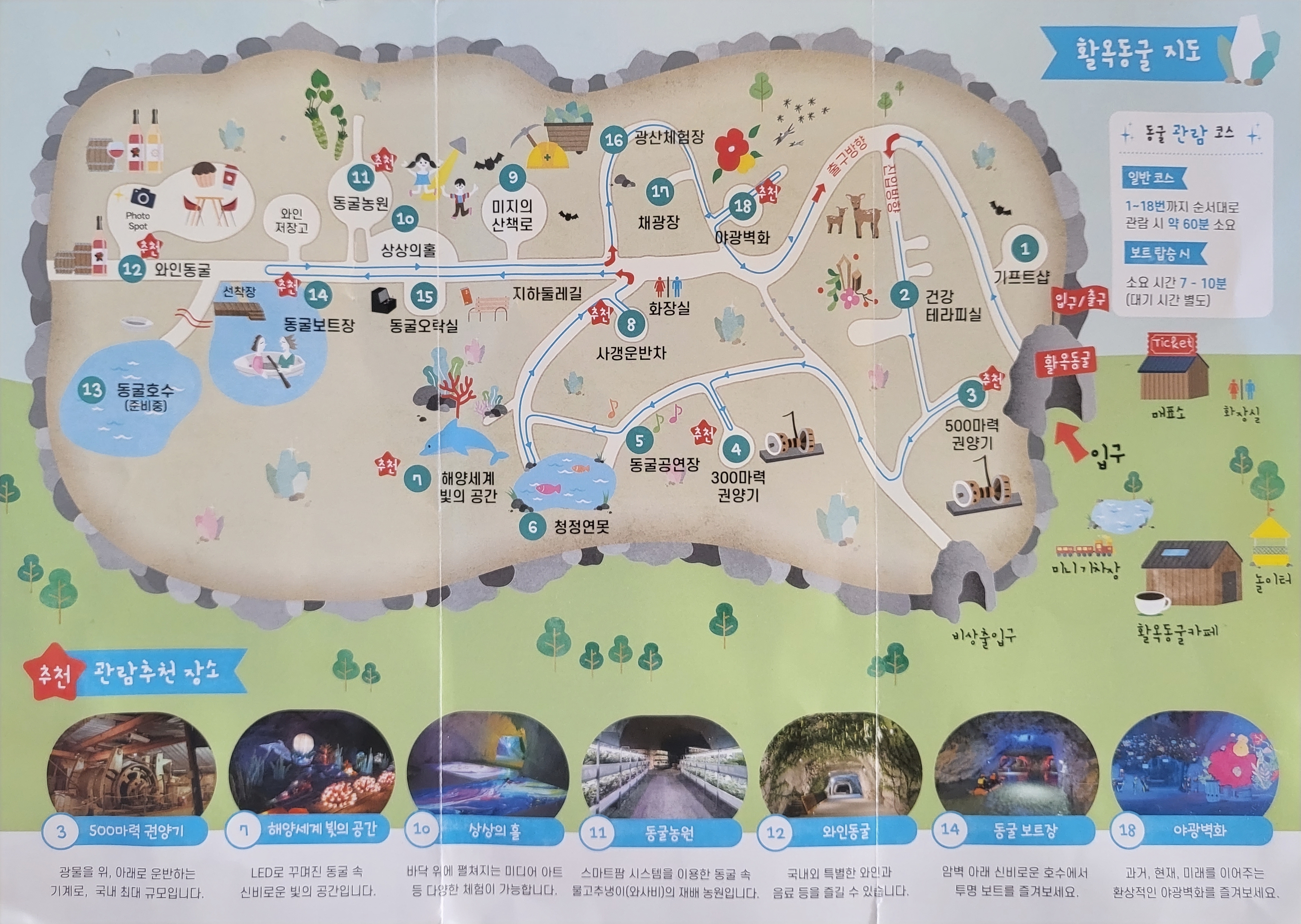 저희는 오후 4시 쯤 활옥동굴 매표소에서 입장권을 구매했어요. 매표소에서 활옥동굴 지도도 나누어 주십니다. 지도를 펼쳐보니 꽤나 다양한 테마로 동굴을 꾸며놨음을 알 수 있었어요. 동굴관광 코스대로 산책하듯 한바퀴 돌고 나오면 거의 한시간 정도 걸린다고 합니다. 저희는 아이들과 함께 보트도 타고 하느라 1시간 30분 정도 걸렸던 것 같아요. 참고로 화장실은 동굴 내부에서도 중심부에 있어 밖으로 나가지 않으셔도 됩니다. 저희는 5번까지 갔는데 큰 아이가 화장실 가고싶다고 해서 밖으로 나갔다가 다시 들어왔어요ㅠㅠ 덕분에 이날 걸음수 12,000보... 지금 보니 화장실이 지도에 나와있었네요...^^