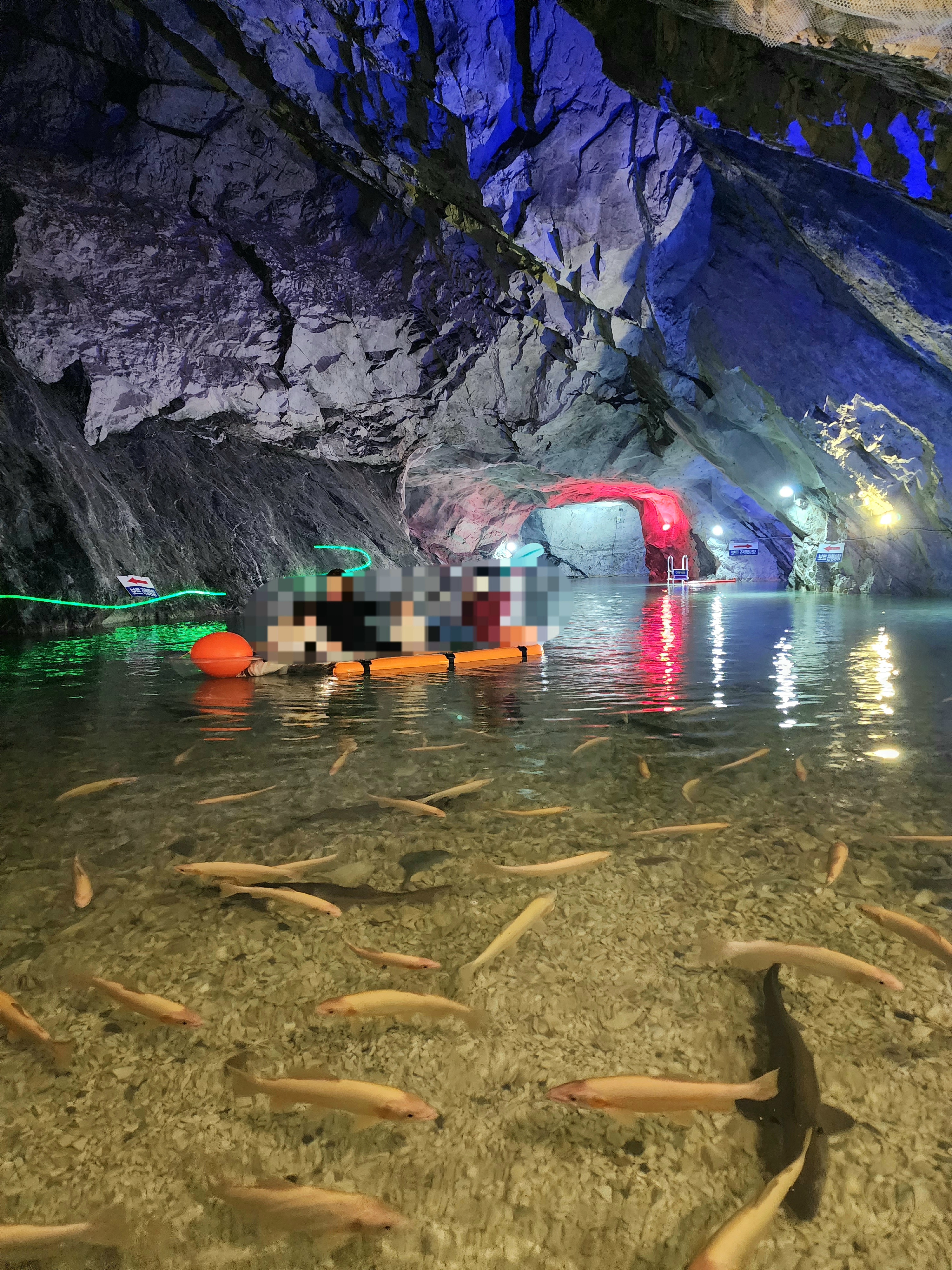 관람 방향이 표시된 것을 따라 쭉 가다보면 동굴보트장이 나옵니다. 투명보트는 2인용, 4인용이 있어요. 아이가 어리면 보호자가 안고 탈 수도 있답니다. 물은 성인 무릎 정도 오는듯 합니다. 보트에 탄 사람 중 맨 끝에 탑승한 한 명은 노를 저어야 하는데 저희 배는 친정엄마가 저어줬어요. 처음엔 좀 엉망진창이었는데 금새 능숙하게 노를 저으시더라고요ㅎㅎ 배를 타고 가다 보면 물고기들이 많이 모여있는 장소가 있어요. 거기 가면 잉어와 철갑상어들이 발 밑에 지나다니는 것을 보트에 앉아 구경할 수 있어요. 아이들이 엄청 좋아했어요!