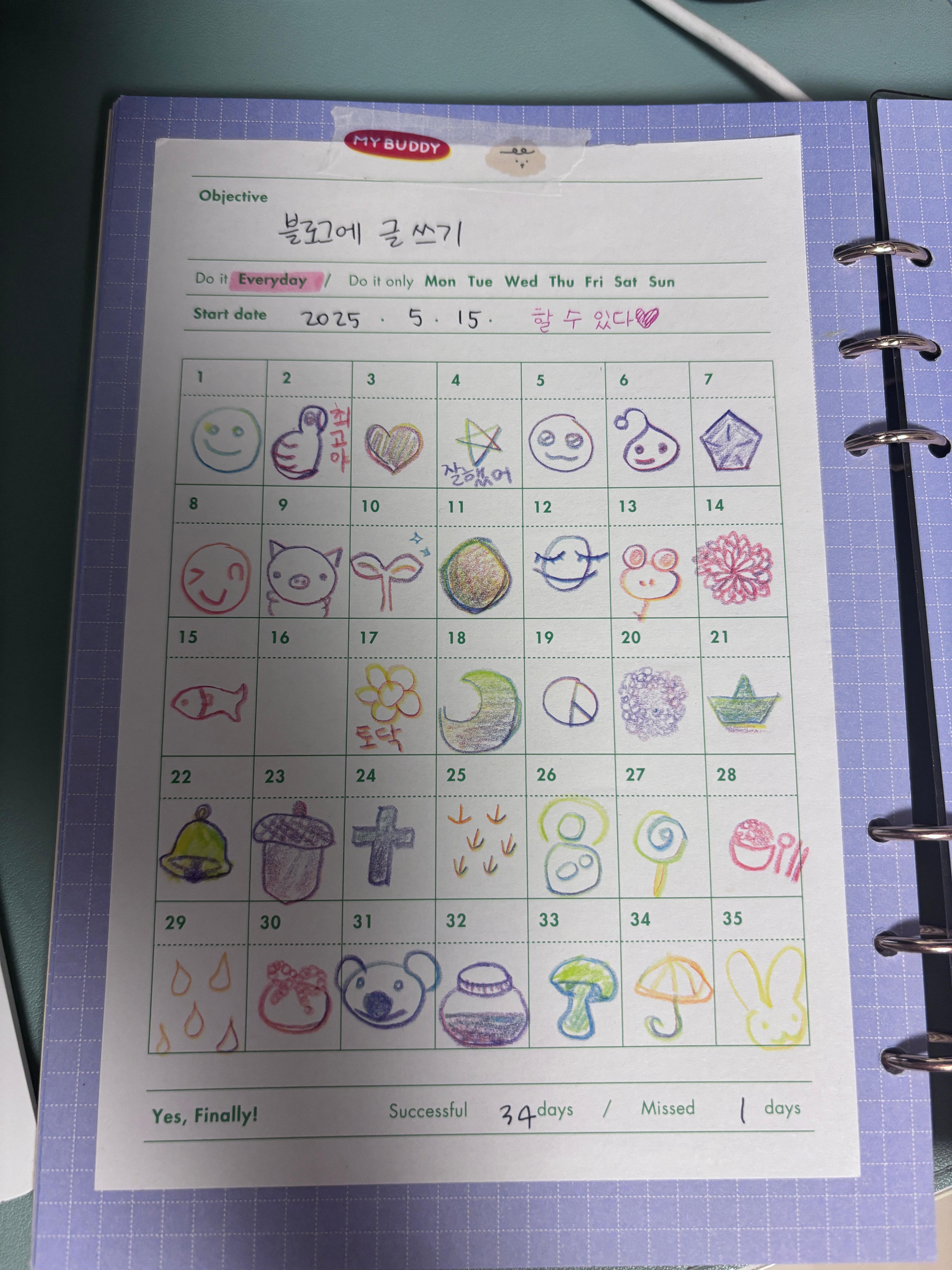 지난 5월 '오십의 태도'를 읽고 저 스스로가 다짐한게 있어요. 좋은 습관을 하나씩 들여보자는 거였죠. 그래서 시작한 35일 습관만들기 트래커로 블로그에 꾸준히 글을 써보기로 했었요. 결과는 35일 중 숙취로 정신 못차렸던 날 하루를 뺀 34일을 성공하였습니다.