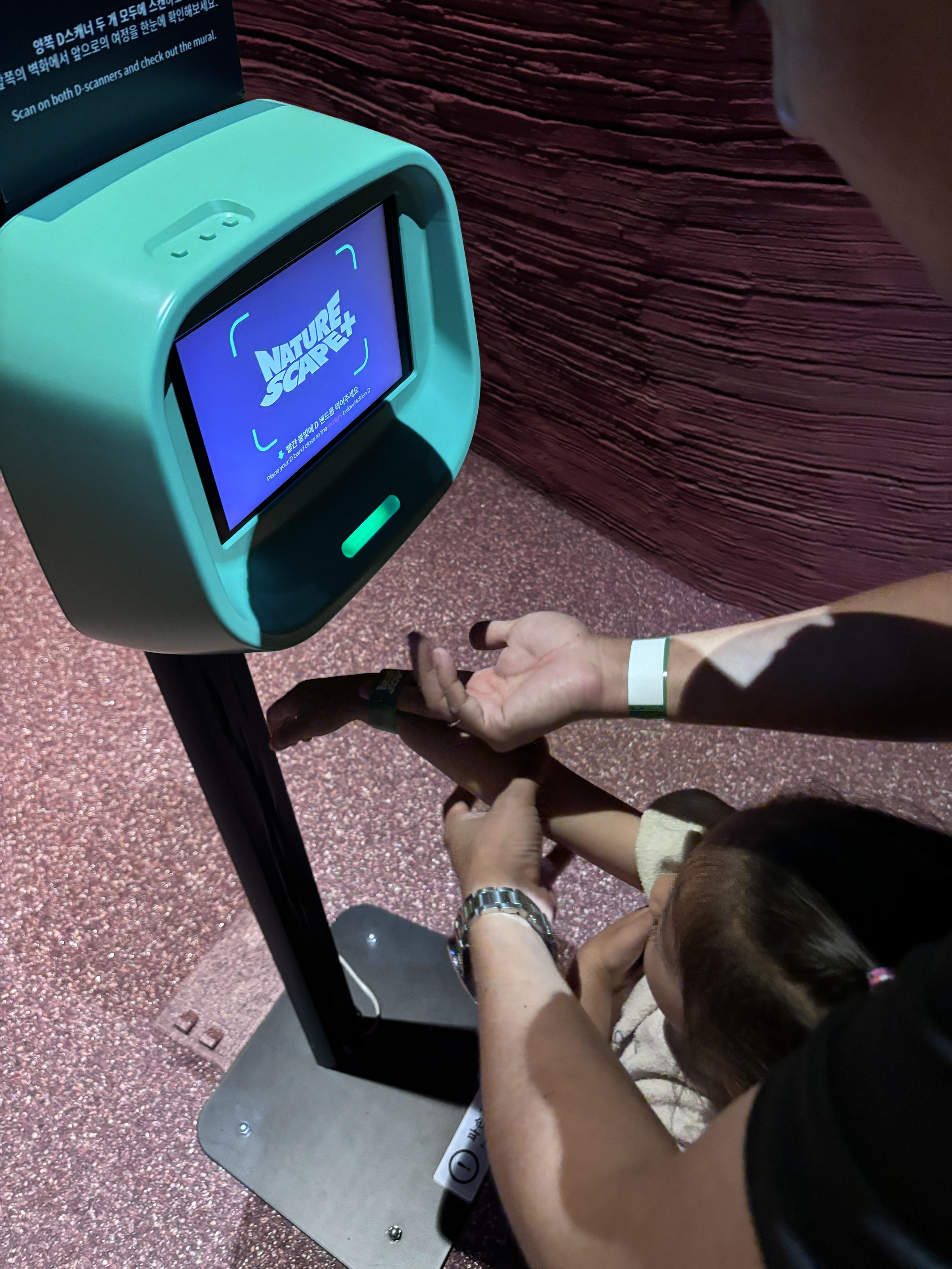 손목에 차고 들어가는 입장팔찌는 아이가 새로운 탐험을 시작하거나 완료하면 기계에 찍을 수 있어요. 다 찍어도 별게 없긴 한데 그래도 기분상 만날때마다 찍어주니 아이들은 좋아하더라고요. 원래 저희가 가려고 했을땐 핸드폰 어플로 큐알코드 찍으면서 탐험하는 거였는데 어플은 이제 사용하지 않는다고 하더라고요. 어플로 찍어가면서 스마트폰으로 정보도 읽어보고 뱃지같은 것도 받으면 초등학생 이상인 아이들은 더 흥미있게 참여했을텐데 조금 아쉬웠어요.